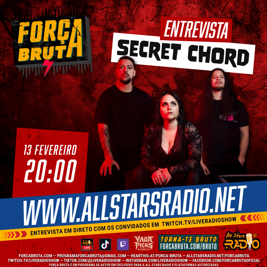 O Força Bruta entra em direto às 20:00 com a nossa seleção habitual de música pesada recente e mais tarde, abrimos espaço para a entrevista com os Secret Chord. A entrevista será também transmitida em vídeo no Facebook do Força Bruta por volta das 21:30.